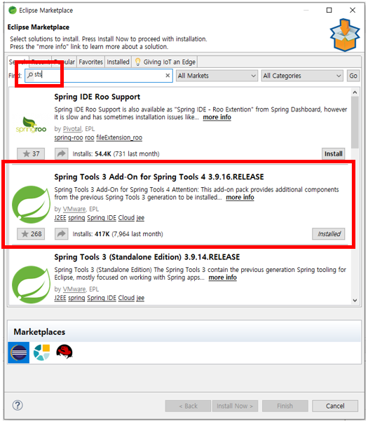 - sts 검색 후 Spring Tools 3 Add-On for Spring Tools 4 → Install 눌러서 설치 진행
