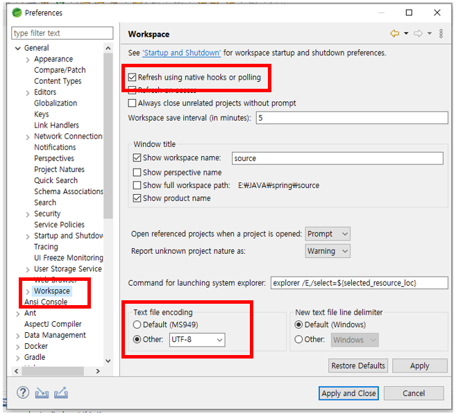 - General → Workspace → encoding → UTF-8 변경