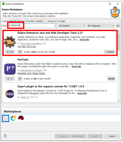 - enterprise 검색 후 Eclipse Enterprise Java and Web Developer Tools → Install 설치 진행