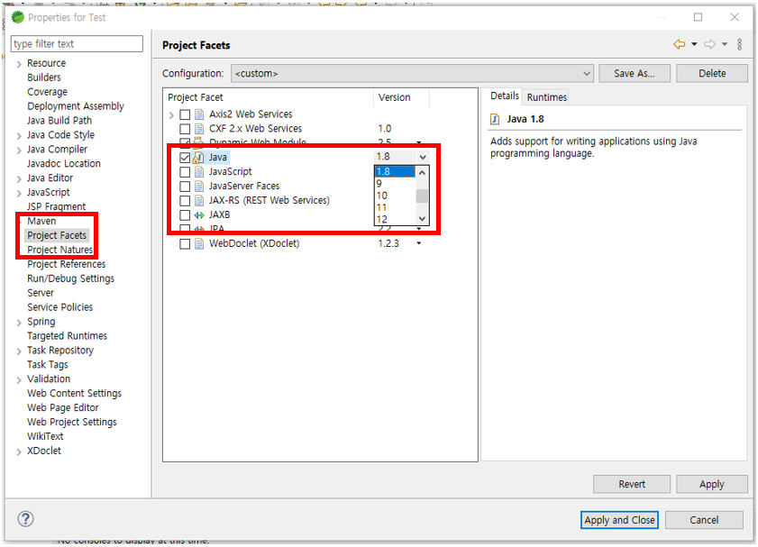 - Project Facets → Java 1.8 버전으로 변경