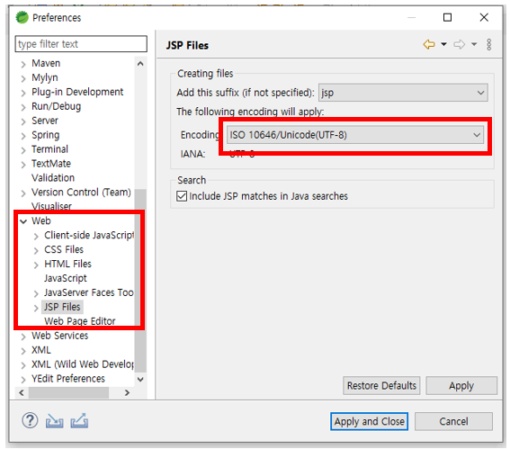 - Web → CSS Files, HTML Files, JSP Files 모두 → Encoding UTF - 8변경