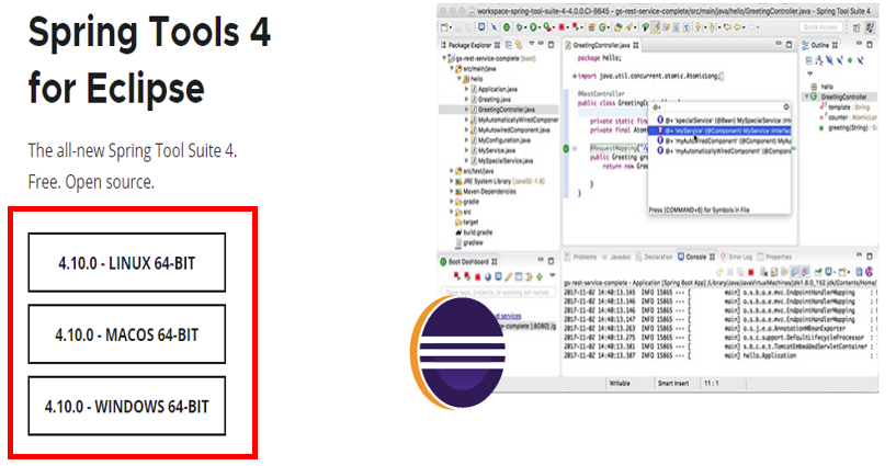 Largely rebuilt from scratch, Spring Tools 4 provides world-class support for developing Spring-based enterprise applications, whether you prefer Eclipse, Visual Studio Code, or Theia IDE.