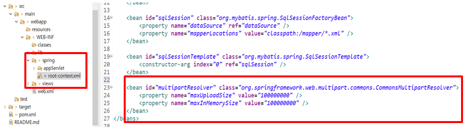 multipartresolver를 사용하기 위해 root-context.xml 에 추가