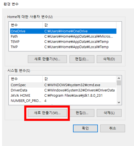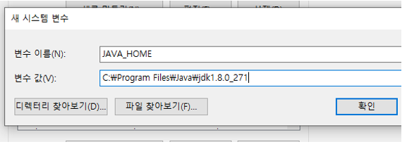 - 새로 만들기 → 변수 이름 "JAVA_HOME" → 변수 값 (JDK 설치 경로로 지정)