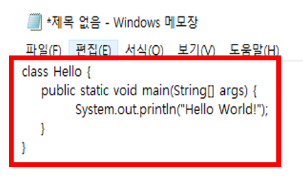 - ex) 아래 소스코드 같은 경우 클래스명이 Hello 이므로 Hello.java 형태로 저장