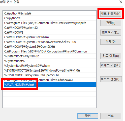 - 시스템 변수 내에 있는 "Path" 선택 후 편집 → 새로 만들기 → %JAVA_HOME%\bin\ 추가
