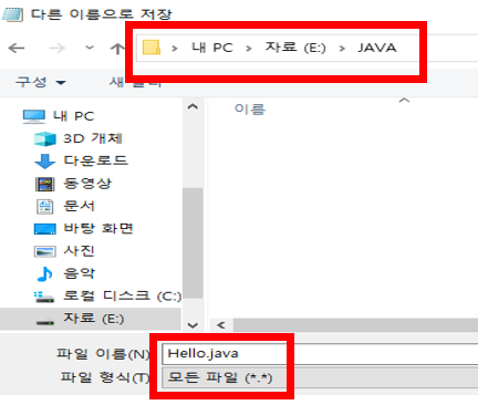 - ※ 주의 저장시 파일이름을 클래스명.java, 파일 형식은 모든 파일로 변경 후 저장해야함