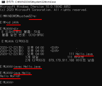 - 현재 Hello.java 파일은 E:\JAVA 경로에 저장을 했으므로 해당 순서대로 명령어 입력