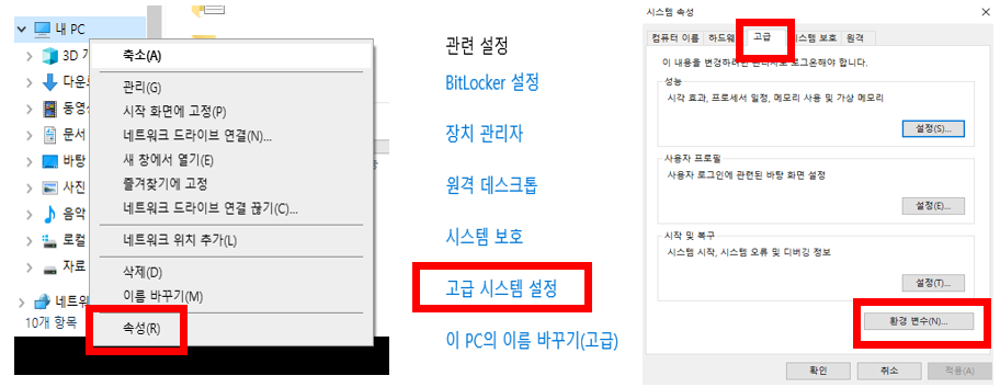 - 내 PC 우 클릭 → 고급 시스템 설정 → 고급 → 환경 변수 순으로 이동