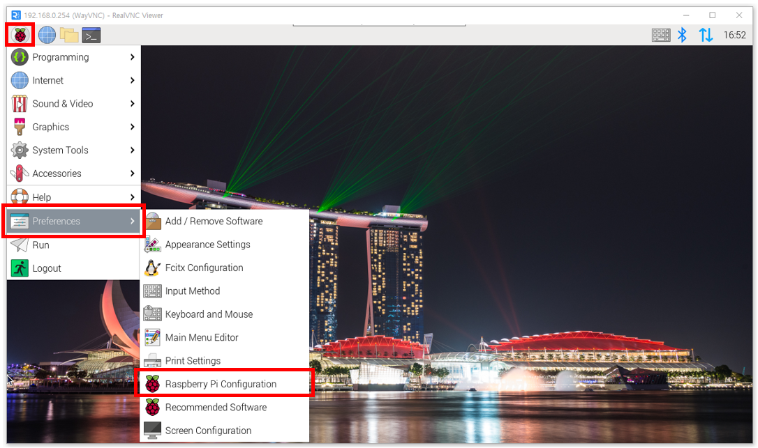 - 좌측 상단 라즈베리 파이 아이콘 클릭 → Preferences → Raspberry Pi Configuration 순으로 클릭