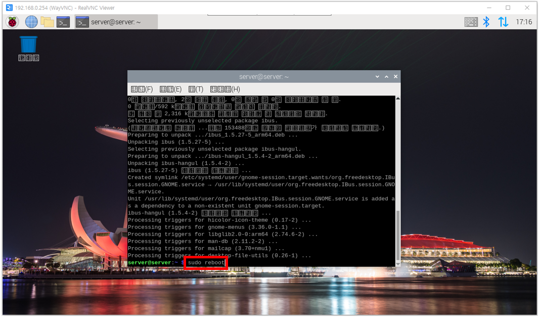 - 설치 완료 후 재부팅을 하기 위해 sudo reboot를 명령어를 입력합니다.